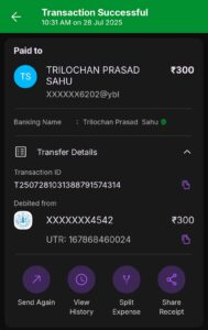 जिसके बाद ऑनलाईन माध्यम (फोन पे) से दिनाँक 28.07.2025 समय 10:31 Am को 300 रूपए त्रिलोचन प्रसाद साहू (MLT) के निजी अकाउंट पर पेंमेट भुगतान किया गया। उक्त थायराइड जाँच टेस्ट रिर्पोट लेने के लिए दूसरे दिन बुलाया गया. बताए गए समय पर पहुंच कर जाँच रिर्पोट प्राप्त कर किया. उक्त जांच रिपोर्ट निजी संस्था manipal trutest द्वारा जारी किया जाना बताया जा रहा हैं..