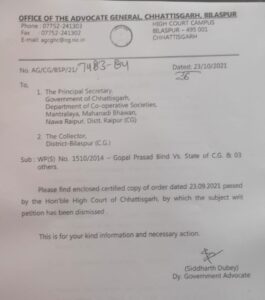 इसी बीच सहकारिता विस्तार अधिकारी गोपाल प्रसाद बिंद ने मामले को माननीय उच्च न्यायालय के समक्ष रखकर स्थगन आदेश वर्ष 2020 में प्राप्त कर लिया था। शिकायतकर्ता ने स्थगन आदेश निरस्त करने के लिए माननीय उच्च न्यायालय के समक्ष आवेदन प्रस्तुत कर आग्रह किया गया। जिस पर वर्ष 2021 में माननीय न्यायालय ने गोपाल प्रसाद बिंद को दिया गया स्थगन आदेश निरस्त कर दिया। स्थगन आदेश निरस्त की जानकारी विभाग के सचिव, जिला कलेक्टर और सहकारिता विस्तार अधिकारी गोपाल प्रसाद बिंद को दिया ।